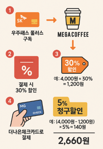 SK우주패스플러스 구독과 MG새마을금고 더나은체크카드(더나은체크카드) 할인은 중복 적용이 가능하며, 이를 통해 메가커피등 제휴처에서 최대 약 50%의 실질 할인을 받을 수 있습니다.