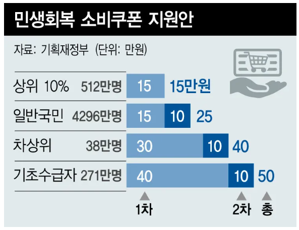 출처)한계레신문 ※ 2차 지급(10만 원)은 소득 상위 10%를 제외한 국민에게만 지급, 특별 추가지급은 농어촌 인구소멸지역 주민에게 1인당 2만원 추가 지급