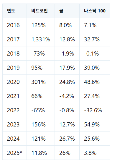 2016년이후 자산별 수익률 비교(최근 10년간), 출처)두나무 2025년, 초기 비트 코인 투자자들의 매도 이유