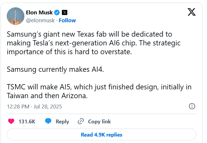 테슬라와 삼성전자는 2025년 7월 공식적으로 삼성전자와 함께하는 AI6 자율 주행 칩 생산을 공식화하였습니다. 2025년 7월 24일부터 2033년 12월 31일까지 약 8년 반 동안 삼성전자 달라고 신공장에서 최첨단 AI칩이 생산됩니다. 이번 계약 크기는 삼성전자 전체 연매출의 약 7.6%에 해당합니다.